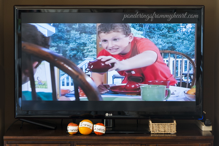 Using the teacher’s guide, we would start out a lesson by watching a video segment. This only took a few minutes and then we would proceed to the lesson’s activities. Most lessons contained one or more activities. The activities might include locating on a map and talking about a Spanish-speaking country, playing a game using Spanish vocabulary, completing a page in the student workbook, placing Spanish word stickers on objects around the house, or reviewing Spanish words through flashcard games. My kids loved all the activities and games!
